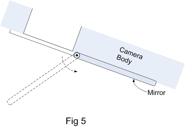 The mirror should be completely retractable to allow recording in the original mode. It should be minimally obstructive while retracted, ideally stowed flat along the camera body. There are several designs to meet this requirement. The hinge can allow the mirror to flip back completely, as shown in Figure 5. The downside here is that the reflecting surface of the mirror will be left exposed and unprotected.