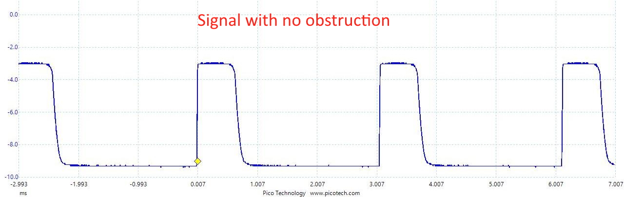 In the wave form shown above (Signal with no obstruction), note that the upward trace is much steeper than the downward line. This causes a higher spike through the 0.1uF capacitor, thus avoiding the need to amplify the resulting output with a transistor.