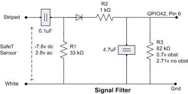 The red LED in the Wall Console button was an obvious choice for the Stop light. According to the Wall Console circuit, the LED can be turned on and off by placing an 82 ohm resistor across the console wire pair. The Garage Minder already had access to these wires. Next, we need to filter the wave from the obstruction sensor to yield a useful TTL signal. To shape the wave, a 0.1uF capacitor eliminates the DC offset. The diode blocks the negative spike. The 4.7uF capacitor acts as a charge tank and the 82K resistor drains the tank. The resulting signal is suitable for the processor; it is high (2.7v) while there is no obstruction and low when there is an obstruction and no AC waves. When the signal is low, then a relay triggered causing the red LED "Stop light" to come on.