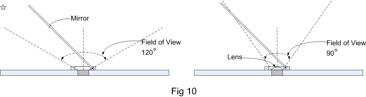 The reflecting surface will need to be large compared to the camera lens. The field of view is a cone with a vertex angle that may exceed 120 degrees for wide-angle cameras. As depicted in Figure 7, a mirror needed to cover the field of view at high tilt angles would have to be very large. An inadequate mirror length is illustrated in Figure 9 (right) and Figure 10 (left.) Undesired light from the star shaped object would be captured in the photograph. Ideally, only reflected light should enter the camera. A solution could be to place a convex lens close to the camera to reduce the camera’s angle of view, as shown in Figure 10 (right.)