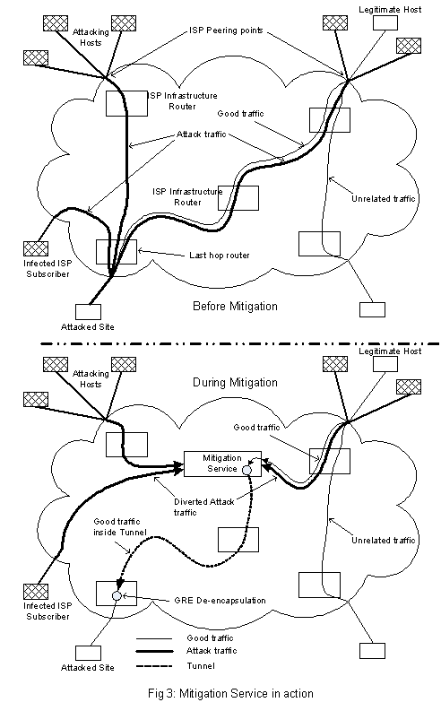 The method involves a network based Mitigation Service and a tunnel. The Mitigation Service comprises several powerful servers and has the capacity to handle large amounts of traffic and connections. All packets addressed to the intended victim are redirected to the Mitigation Service. Various techniques are used there to distinguish between legitimate and attack traffic. One key technique assumes that legitimate traffic is originated by sentient human users that can interactively respond to simple questions, while attack traffic comes from automated Bots that cannot respond correctly. This helps filter legitimate traffic from attack traffic. Legitimate traffic is forwarded through a tunnel to the intended victim, while attack traffic is discarded. Legitimate IP addresses are white-listed thereby improving performance.