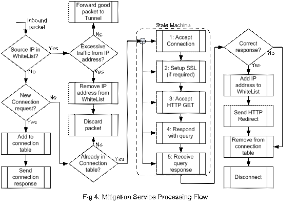 IP addresses that have been added to the White List typically stay on the list until the mitigation service is terminated. However, as shown in Fig 4, even traffic from these hosts is checked for abusive characteristics. If there are excessive connection attempts or unusually high traffic per unit of time, then the IP address will be removed from the White List. This protects against situations where a Bot may have somehow responded correctly to the interactive question. It also protects against situations where a Bot and a legitimate host are both behind a NAT (Network Address Translation) gateway. This can happen if one of the computers in a large company or a residential subscriber’s home gets infected and is acting as a Bot. In this case, the Bot and the legitimate host will both have the same source IP address at the Mitigation Service. If the legitimate host gets White Listed, then the Bot’s attacks will get through. Various other well known techniques (like signature detection) can also be used to detect Bot attacks in White Listed traffic. Unfortunately, the legitimate host will be denied service due to the existence of the Bot in the originating NAT zone.