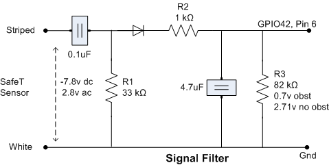 The red LED in the Wall Console button was an obvious choice for the Stop light. According to the Wall Console circuit, the LED can be turned on and off by placing an 82 ohm resistor across the console wire pair. The Garage Minder already had access to these wires. Next, we need to filter the wave from the obstruction sensor to yield a useful TTL signal. To shape the wave, a 0.1uF capacitor eliminates the DC offset. The diode blocks the negative spike. The 4.7uF capacitor acts as a charge tank and the 82K resistor drains the tank. The resulting signal is suitable for the processor; it is high (2.7v) while there is no obstruction and low when there is an obstruction and no AC waves. When the signal is low, then a relay triggered causing the red LED "Stop light" to come on.