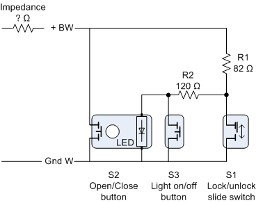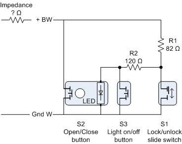 I also investigated the voltage levels on the "Wall Console". Besides the button to open/close the door, there is a switch to lock the door and a button to toggle the light on/off. The circuit is shown below. Once I understood the opener's design, I got ideas for new features.